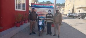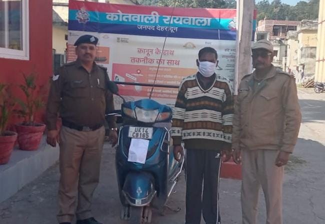 रायवाला ( राव शहजाद ) । कोतवाली रायवाला पुलिस ने स्कूटी चोरी के आरोपी को गिरफ्तार किया है। इस दौरान आरोपी से स्कूटी भी बरामद की । बात दे बीते 14 नवम्बर को गोविंद राम पुत्र इन्द्रमणि निवासी गौहरीमाफी के द्वारा दी गई तहरीर पर रायवाला पुलिस ने कारवाई करते हुए आरोपी को मुखबिर की सूचना पर मोतीचूर जंगल के पास से गिरफ्तार किया है। पुलिस से मिली जानकारी के अनुसार आरोपी के विरद्ध पूर्व में भी राजस्थान में लूट व चोरी के अभियोग पंजीकृत है। इसी युवक ने रायवाला से भी स्कूटी चोरी की थी। आरोपी ने में पूछताछ में बताया कि उक्त एक्टिवा को अपने पास रखी मास्टर की से खोलकर पैट्रोल पम्प प्रतीतनगर रायवाला से चोरी किया था ।