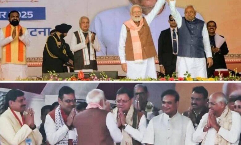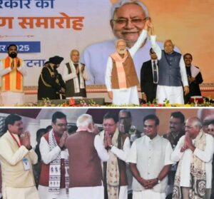 देहरादून ( राव शहजाद ) । प्रधानमंत्री नरेन्द्र मोदी की उपस्थिति में गाँधी मैदान, पटना में आयोजित बिहार की नवनिर्वाचित सरकार के शपथ ग्रहण समारोह में मुख्यमंत्री पुष्कर सिंह धामी सम्मिलित हुए। इस अवसर पर उन्होंने नवनिर्वाचित मुख्यमंत्री एवं मंत्रिपरिषद के सदस्यों को हार्दिक शुभकामनाएं एवं बधाई दी। मुख्यमंत्री ने कहा कि बिहार और उत्तराखण्ड के बीच ऐतिहासिक, सांस्कृतिक और सामाजिक संबंध रहे हैं। उन्होंने विश्वास व्यक्त किया कि नई सरकार के नेतृत्व में बिहार राज्य नई ऊर्जा और संकल्प के साथ विकास की नई ऊँचाइयों को प्राप्त करेगा। कार्यक्रम के दौरान मुख्यमंत्री पुष्कर सिंह धामी ने देश भर से पहुंचे विभिन्न राज्यों के गणमान्य नेताओं से भी शिष्टाचार भेंट की और उनसे राष्ट्रीय विकास, सुशासन तथा समन्वित प्रगतिशील नीतियों पर विचार-विमर्श किया।